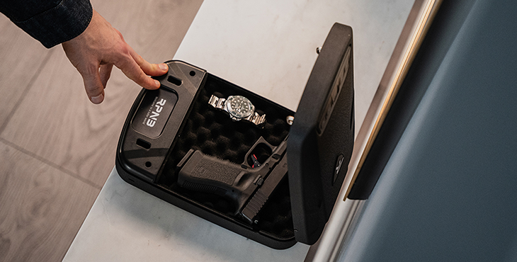 Compact handgun safe with LED lighting for easy access in the dark. Soft foam padding protects items from scratches. Silence Mode option mutes electronic sounds